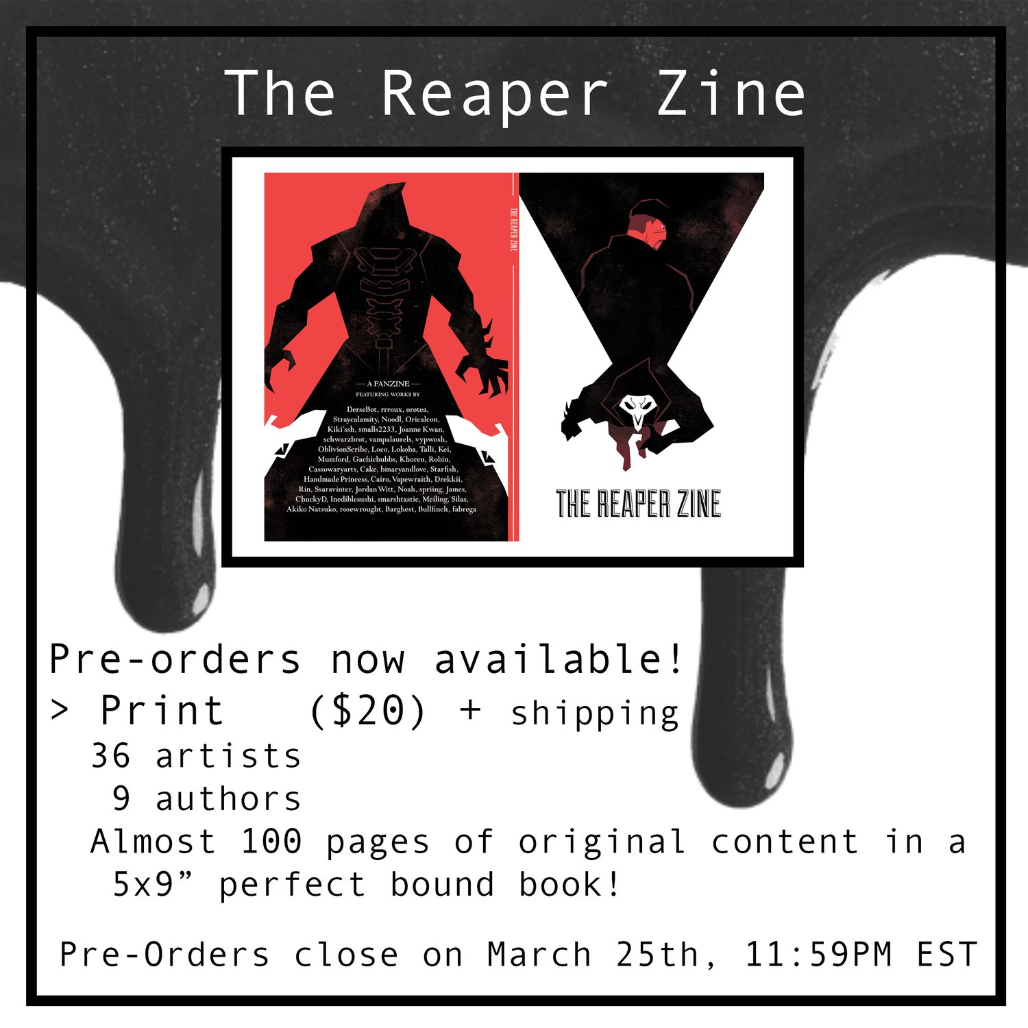 The print edition of The Reaper Zine will be over 90 pages long featuring 39 pages of art from 36 artists and over 50 pages of writing from 9 authors.